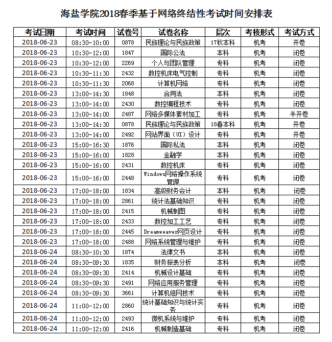 海盐学院2018春季基于网络终结性考试时间安排表