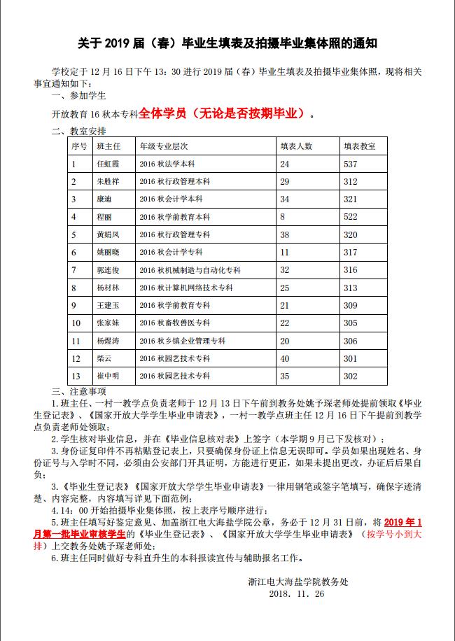 关于2019届(春)毕业生填表及拍摄毕业集体照的通知