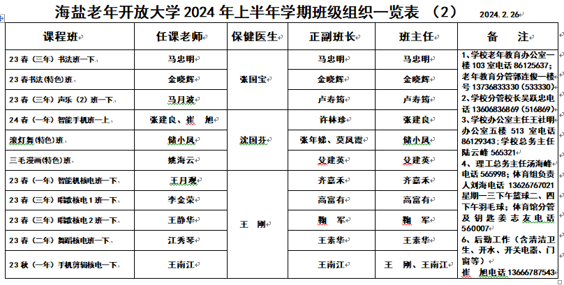 海盐老年开放大学2024年上半年学期班级组织一览表