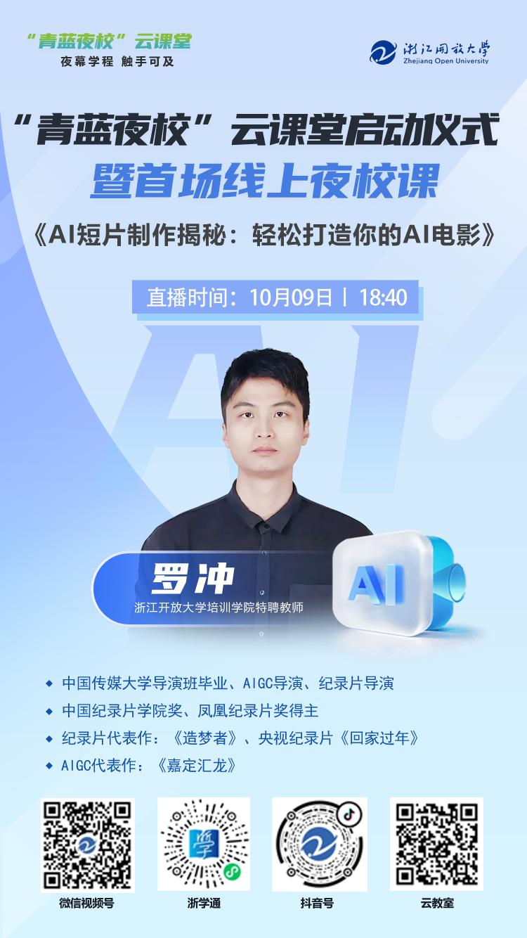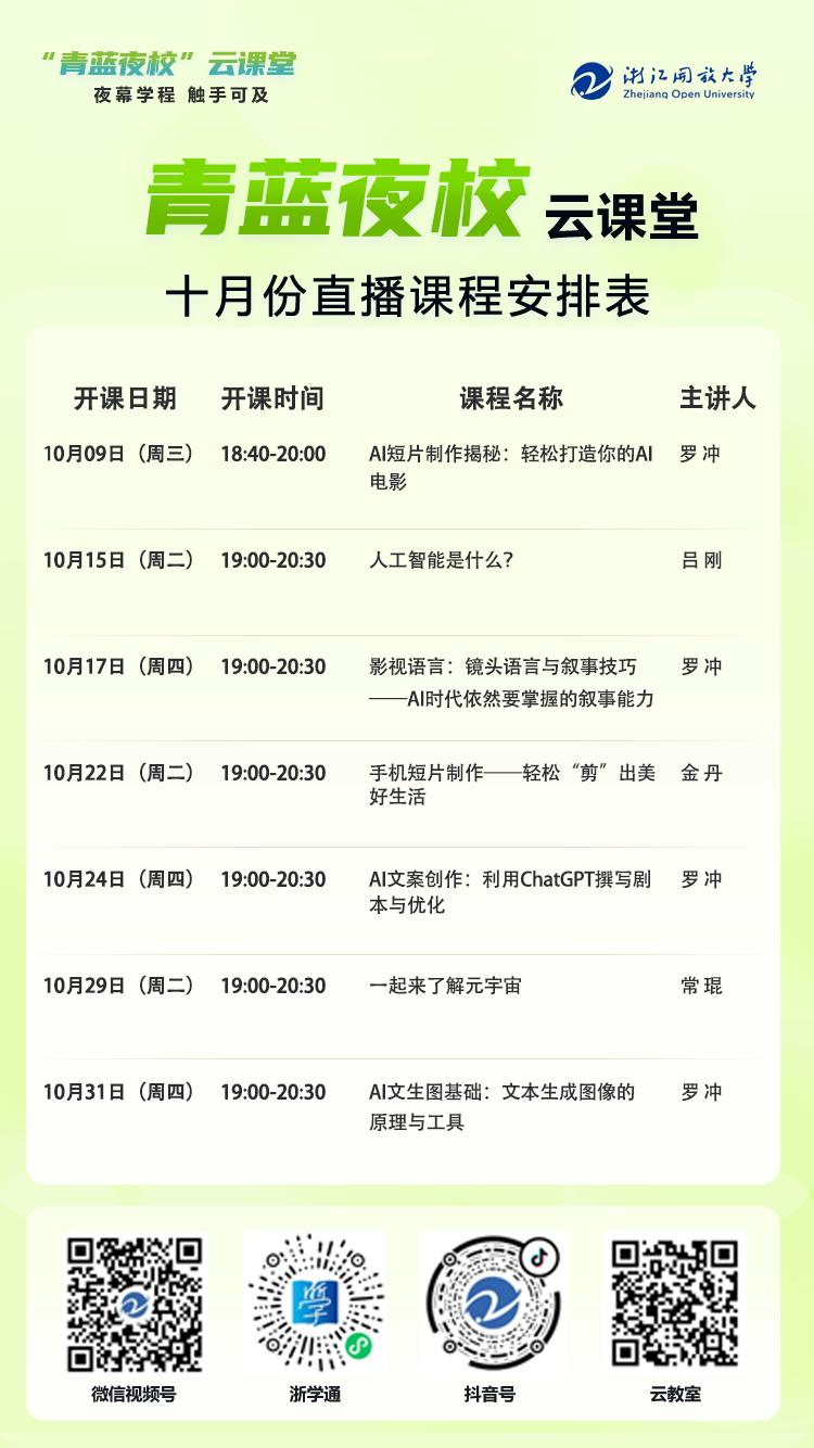 浙江开放大学将于 2024 年 10 月 9 日 18:40 举办“青蓝夜校”云课堂启动仪式暨首场夜校线上课活动。活动主会场设于浙江开放大学教工路校区 A 区四楼融媒体中心演播大厅。